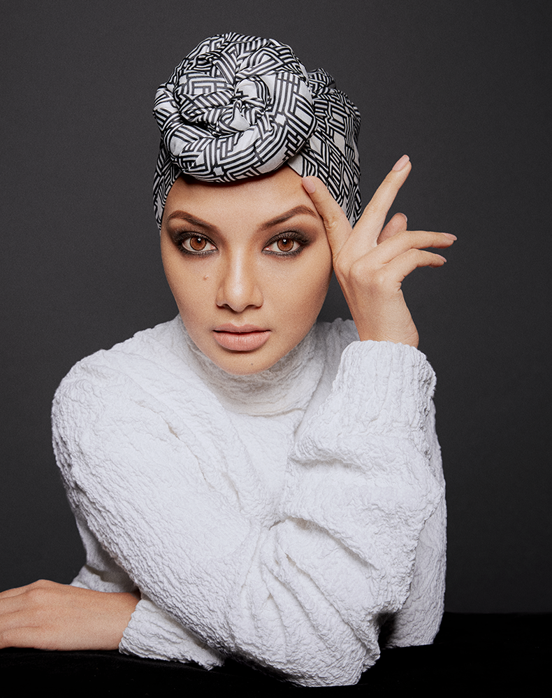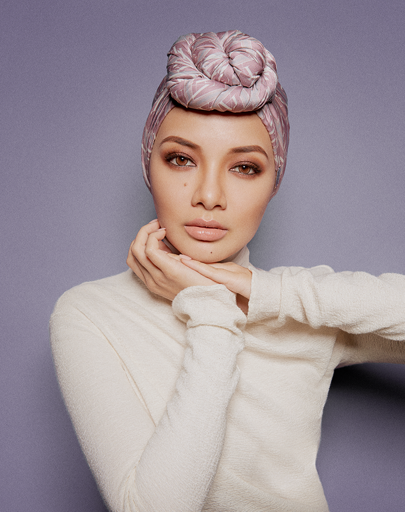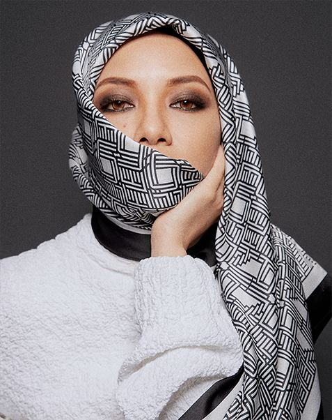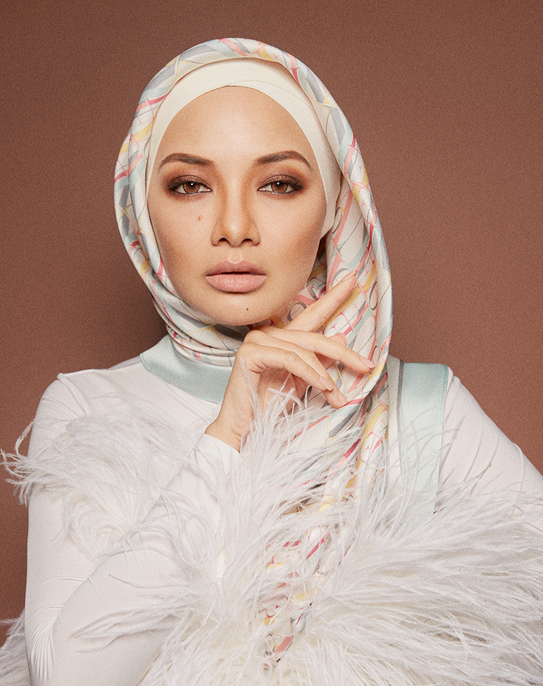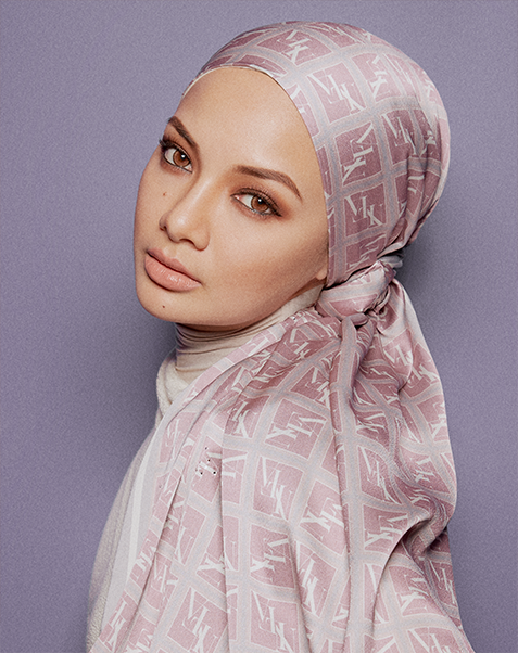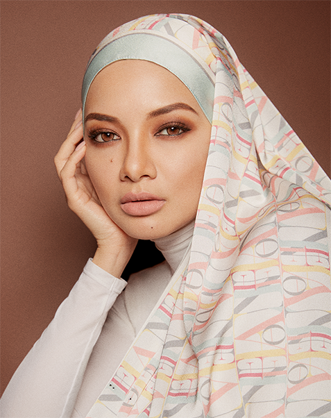 Light pastel tones against clean white satin silk to reflect the blossoming of a young woman. The puzzle of letters, structured yet dispersed, but clear enough to find the meaning of the word: Neelofa, the woman behind the collection.